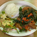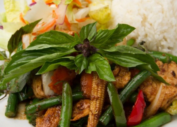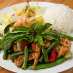 Chopped chicken, onions, green beans, bell peppers, and Thai basil stir fried in a fresh chili garlic sauce.Served on rice and with a side salad