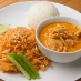Red curry chicken (spicy), phad Thai noodles (no meat), and rice.