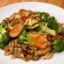 Broccoli, carrots and oyster sauce served over wide rice noodles.