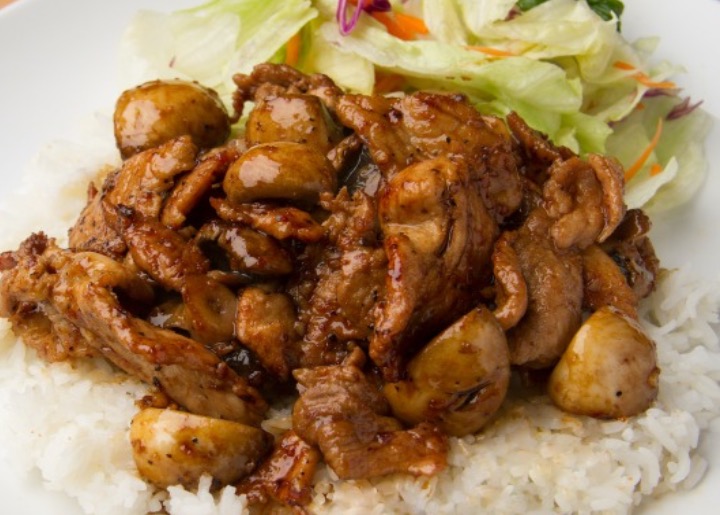 Deep fried chicken coated in a sweet and savory honey garlic sauce topped with red bell peppers, crisp basil and crunchy garlic. Served with rice and a side salad.