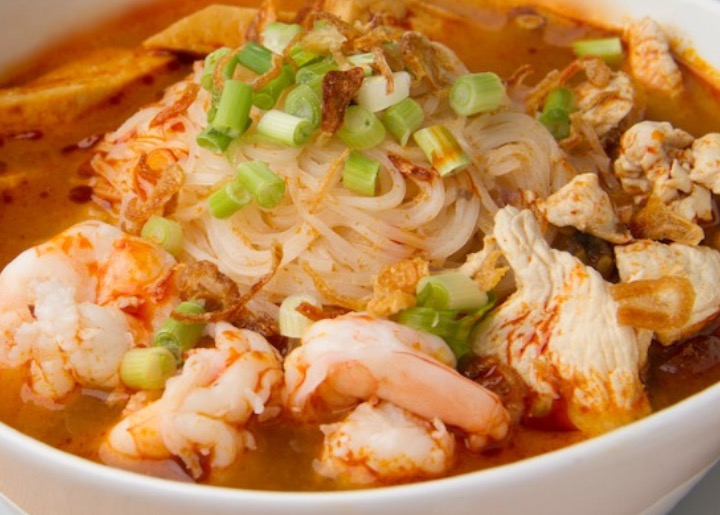 Rice noodles, chicken, shrimp, tofu, bean sprouts, and green onions in a tasty tom yum flavored broth. Gluten-free.